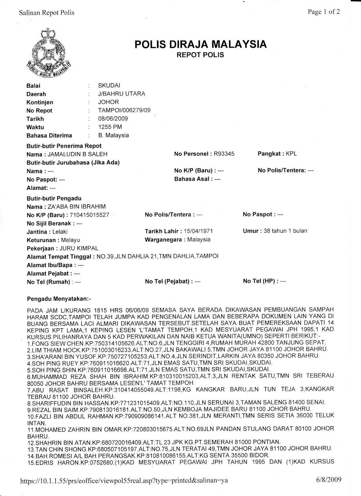 Suara Alam Maya Gambar Salinan Report Polis Majlis Bandaraya