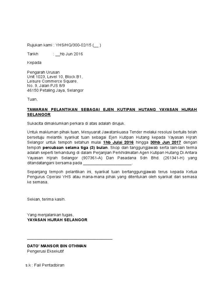 Surat Perlantikan Pasadana Ejen Kutipan Hutang