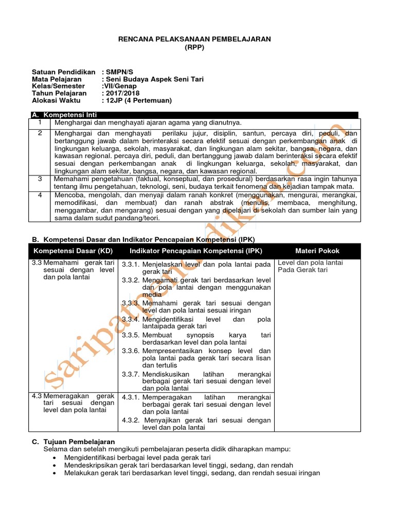 Download Contoh Rpp 1 Lembar Seni Tari Kelas 7 Smp Mts Semester 1