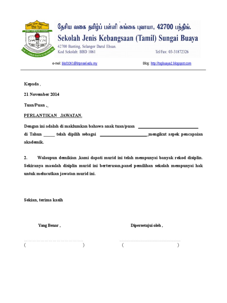 Contoh Surat Rasmi Lantikan Jawatan Kabar Blok