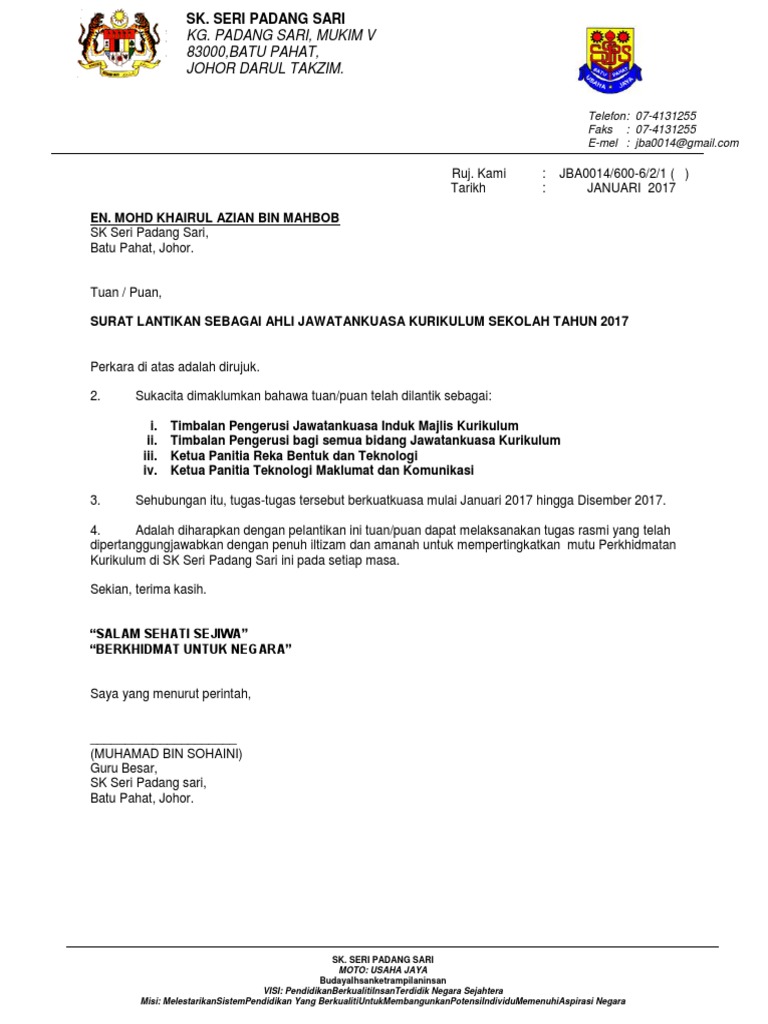 Surat Pelantikan Pelepasan Ajk Hakim Mtq Nasyid Dan Kalam Jamaie