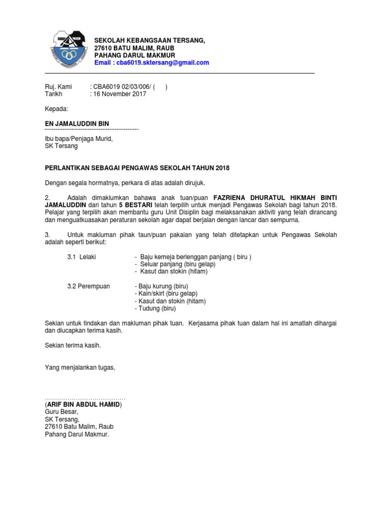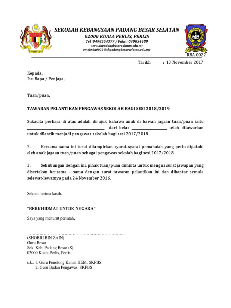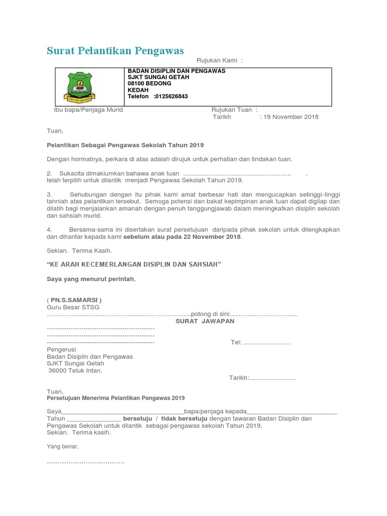 Contoh Surat Rasmi Pelantikan Pengawas