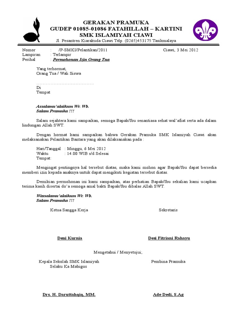 Kunjungi perpustakaan pramuka khusus buku kepramukaan di kwarcab kota semarang. Soedirman dan dewi sartika gudep xi 01 13 141 142 smk darussalam karangpucung akan menyelenggarakan kegiatan pelantikan pramuka penegak bantara tahun 2012 2013 dengan ketentuan sebagai berikut. Contoh format surat undangan pramuka sekarang kami ingin menunjukan kepada anda mengenai format surat undangan pramuka yang kami buat untuk memudahkan anda dan juga untuk memberi contoh format surat undangan pramuka yang biasanya. Sehubungan dengan akan diadakannya perkemahan jum at sabtu dan minggu perjusami pramuka penegak sebagai pelantikan tingkat bantara serta pembekalan materi kepramukaan khususnya anggota pramuka ambalan k h.