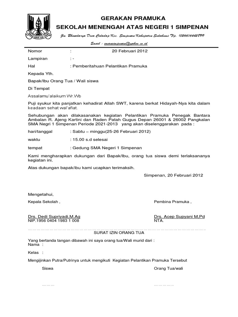 Ada banyak surat seperti ini yang dibutuhkan di sekolah misalnya ada surat pemberitahuan rapat pemberitahuan pentas seni kegiatan class meeting dan kegiatan ekstrakurikuler contoh surat izin orangtua dalam kegiatan sekolah untuk contoh kali ini yang akan di bahas adalah pemberitahuan kegiatan ekskul yaitu ekskul pramuka. Jika belum tau kakak jelasin dewan penggalang adalah anggota gerakan pramuka yang dipercaya untuk mengemban tugas dan tanggung jawab sebagai pengurus atau dewan kehormatan dalam struktur suatu gugus depan. Mohon memperkenalkan diri terlebih dahulu. Berikut contoh surat undangan resmi organisasi pramuka dalam format ms word silahkan didownload pada link dibawah ini jika membutuhkannya.